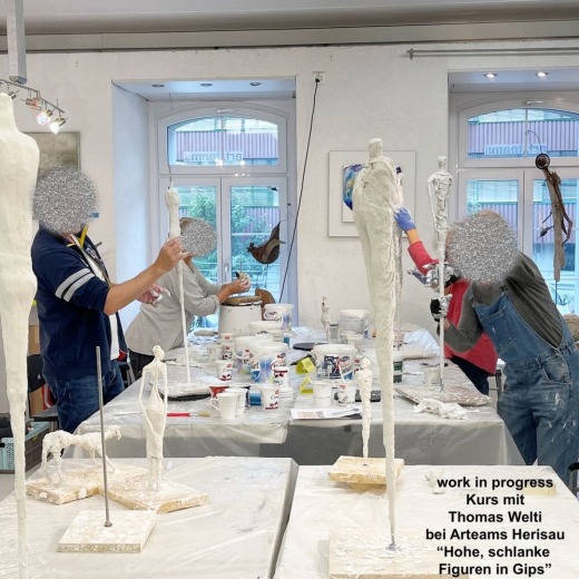 Nach einer kurzen Einführung über Gips, Werkzeug, Arbeitstechniken und Anatomie, gestalten wir auf einem vorgefertigten Metallständer unsere eigene Kreation. Grosse, schlanke Figuren verzaubern uns. Möglich sind Höhen bis ca. 120 cm.