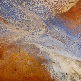 Wasser spült Sand und Farben über die Strukturen der selbst angerührten Spachtelmassen. Der Wind (Fön) weht Sand und Pigmente an die Landmassen, Feuer brennt Spuren in unsere Bilder.