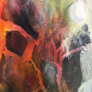 Feingliedrige Strukturen, auf unterschiedlichste Arten hergestellt, mit dem Malmesser, Folien, Schablonen, Stifte, Zeichenfeder, Monotypien, Pastell… bereichern diese kreative Mixed Media Malerei.