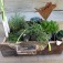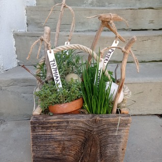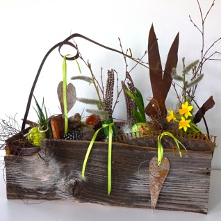 Ein Metallband oder -draht wird zum Henkel geformt. Wenn das Kistchen fertig gezimmert ist, bepflanzen wir es mit Frühlingsschönheiten und passend zu Osten dekorieren wir es mit Tontöpfchen, Ostereiern und Hasenohren, welche aus rostigem Blech ausgeschnitten werden können.