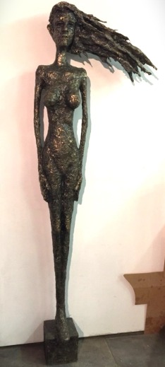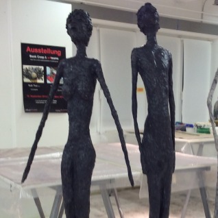 Diese grosse, schlanke Figuren können bis maximum 2 Meter gross sein und bekommen am Schluss eine Schicht aus einer Acrylfarbenmischung, die sie wie Bronze-Figuren aussehen lässt.
