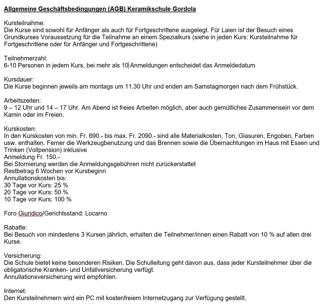 - sämtliches Kursmaterial (Ton, Glasuren, Engoben, Farben)